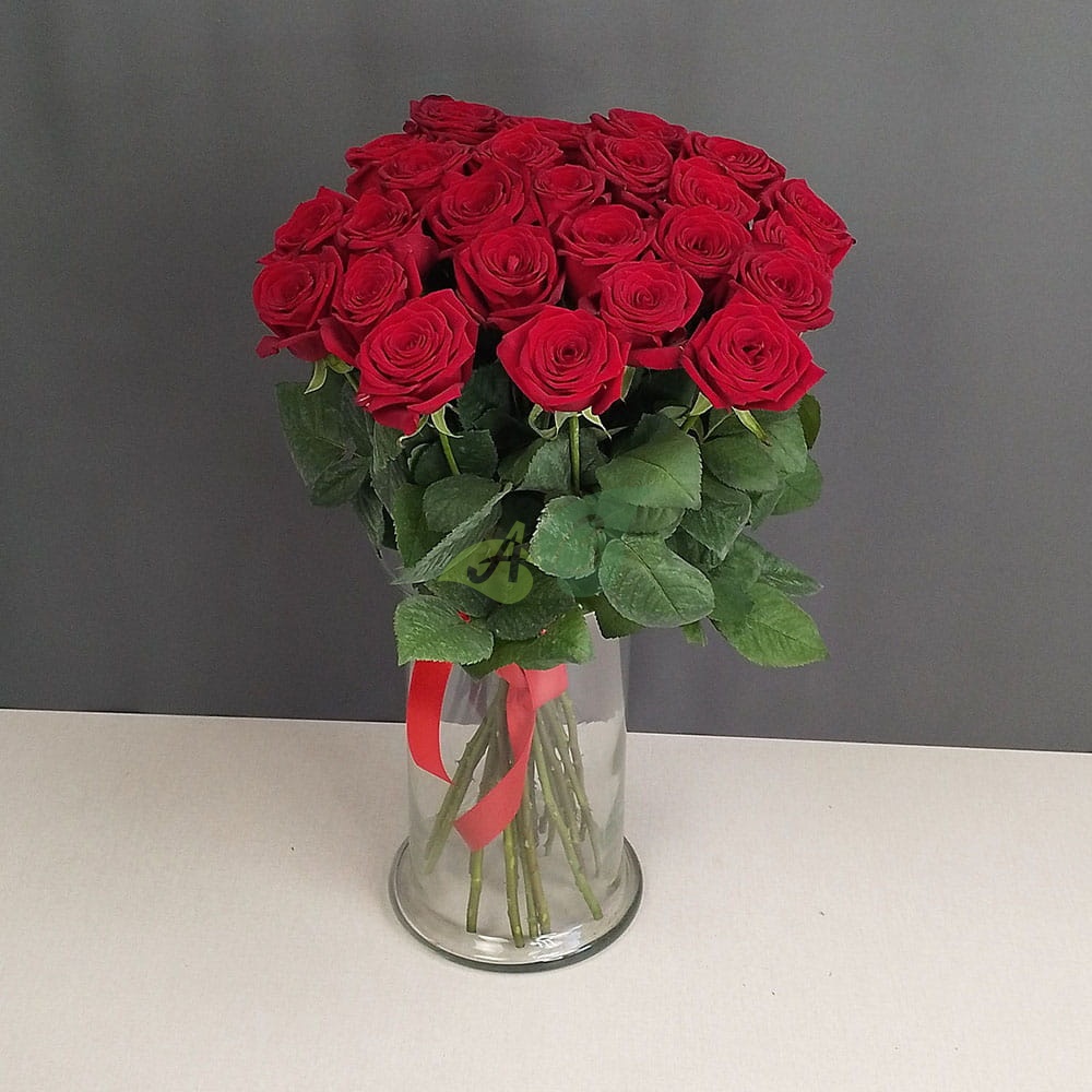 - Роза - 25 штук, цвет - красный, длина стебля - 60 см;